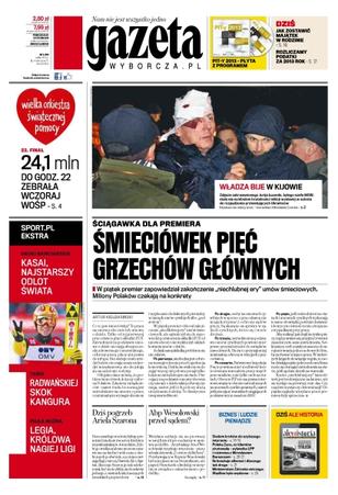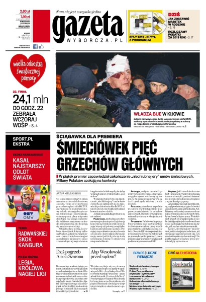 W piątek premier zapowiedział zakończenie „niechlubnej ery” umów śmieciowych – miliony Polaków czekają na konkrety; po śmierci Dominiki, do której karetka nie dojechała na czas, Wielka Orkiestra Świątecznej Pomocy chce naprawić działanie pogotowia; Watykan szykuje się na pierwszy w swej historii proces karny w sprawie pedofilii; dziś odbędzie się pogrzeb zmarłego w sobotę byłego premiera Izraela Ariela Szarona; jak przekazać majątek; pierwszy PIT po ulgowej rewolucji; codziennie spędzamy od trzech do pięciu godzin w krainie WWW; dlaczego tylko trzy osoby wydawały i nadzorowały setkę łupkowych koncesji; Agnieszka Radwańska i Jerzy Janowicz mieli problemy ze zdrowiem, ostatnie mecze przegrali w kiepskim stylu – czy na Australian Open wstąpi w nich nowa energia; po sześciu etapach Rajdu Dakar aż trzy załogi z Polski są w najlepszej dziesiątce.
