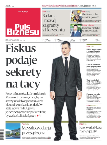 Badania i rozwój za granty z Horyzontu; resort finansów, którym kieruje Mateusz Szczurek, chce, by na straży właściwego stosowania klauzuli o unikaniu podatków stała nowa rada; Eni już nie chce gazu z polskich łupków; fundusz Arx Equity Partners o kolejny rok przesuwa wyjście z inwestycji w Komex, operatora sklepów z odzieżą dziecięcą; wyprzedaż akcji Cash Flow pod lupą; dlaczego Play nie oprotestuje przydziału częstotliwości Sferii; Sąd Najwyższy nie przyjął kasacji większościowego wspólnika Kraków Business Parku; sektor finansowy spodziewał się, że start Plus Banku wywoła lekkie trzęsienie ziemi – może jednak spać spokojnie.