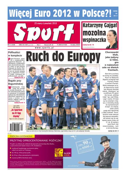 Chorzowski klub jako jedyny w lidze gra o najwyższe cele na dwóch frontach; władze UEFA przyznały wczoraj, że wobec ukraińskich opóźnień przygotowań do Euro 2012 możliwe jest nie tylko ograniczenie liczby miast-organizatorów, ale także nieproporcjonalny podział turniejowych aren między oba kraje; wystarczyło kilka tygodni, żeby Arkadiusz Onyszko stał się liderem nie tylko swej