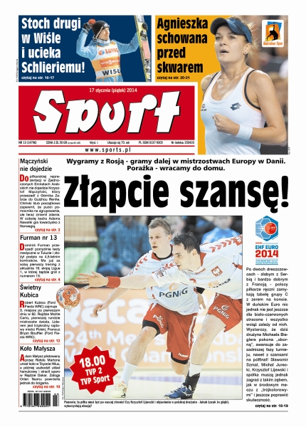 Jeżeli wygramy z Rosją – gramy dalej w mistrzostwach Europy w Danii porażka oznacza powrót do domu; Stefan Florenski to jedyny polski piłkarz, który zagrał w pamiętnym meczu ze Związkiem Radzieckim na Stadionie Śląskim, a trzynaście lat później z Górnikiem w finale Pucharu Zdobywców Pucharów; dwa dni po „Złotej Piłce” Cristiano Ronaldo w meczu pucharowym otrzymał prezent od bramkarza Osasuny; polska załoga M-Sportu wygrała pierwsze dwa odcinki specjalne 82. Rajdu Monte Carlo, a po premierowym etapie zajmuje trzecie miejsce; wspaniały obraz czterech polskich kierowców w czołowej dziesiątce Rajdu Dakar zmąciła przygoda Adama Małysza na etapie do El Salvador – orzeł z Wisły uszkodził zawieszenie na pustyni Atakama, spalił hamulce i wjechał na CP3 ze stratą 3 godzin 45 minut; Polana Jakuszycka jest już gotowa na zawody Pucharu Świata.