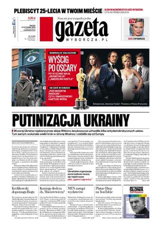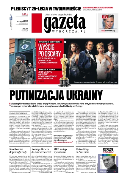 Wczoraj Ukraina rządzona przez ekipę Wiktora Janukowycza uchwaliła kilka antydemokratycznych ustaw – tym samym wykonała wielki krok w stronę Moskwy i oddaliła się od Europy; czy powstanie komisja śledcza ds. Macierewicza; europosłowie przyjęli rezolucję broniącą swobody przemieszczania się obywateli UE; rewolucja na polskim rynku telewizji internetowej: YouTube wprowadza kanały płatne; narasta konflikt Komisji Europejskiej z Rosją o łamanie unijnego prawa w umowach o gazociąg South Stream; sto lat po śmierci dr Julian Ochorowicz znów rozpala serca i umysły mieszkańców Wisły; wczoraj w Los Angeles ogłoszono nominacje do nagród Amerykańskiej Akademii Filmowej; jak mówić o nauce dzieciom, które nie mają w domu prądu i wierzą, że błyskawice kontroluje czarownik z ich wioski; Niemiec Andreas Wellinger wygrał konkurs w Wiśle, wyprzedzając Kamila Stocha o 0,9 pkt. – Polak obronił pozycję lidera Pucharu Świata.