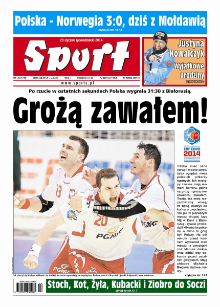Polska - Białoruś 31:30 – przegrywać 3 bramkami 180 sekund przed końcem meczu, a mimo to wygrać – to potrafią tylko biało-czerwoni; Serena Williams została boleśnie pozbawiona marzeń o zdobyciu klasycznego Wielkiego Szlema; po konkursach w Zakopanem trener Łukasz Kruczek podał skład 5-osobowej drużyny na igrzyska w Soczi; Justyna Kowalczyk w dniu swoich 31. urodzin odniosła 30. zwycięstwo w Pucharze Świata; Artur Szpilka (16 zw. - 12 KO), który 25 stycznia stoczy walkę w wadze ciężkiej z Amerykaninem Bryantem Jenningsem (17 zw. - 9 KO), jest już w Stanach Zjednoczonych.