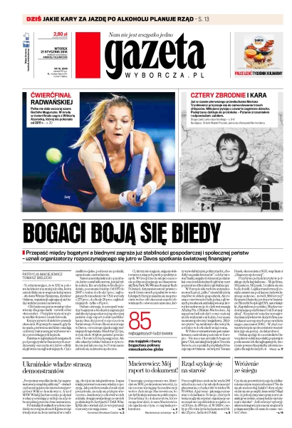 Przepaść między bogatymi a biednymi zagraża już stabilności gospodarczej i społecznej państw – uznali organizatorzy rozpoczynającego się jutro w Davos spotkania światowej finansjery; ukraińskie władze straszą demonstrantów; Macierewicz: Mój raport to dokument; rząd szykuje się na starość; na co chorują lekarze od raka; Opus Dei walczy z gender za pieniądze z Unii.