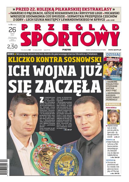 Wywiad z Kamilem Kosowskim, skrzydłowym Apoel Nikozja; Yssouf Kone dołączył do grona napastników, którzy mogą w nowym sezonie zastąpić Roberta Lewandowskiego; Real Madryt rozbił 4:2 Getafe i wrócił na fotel lidera Primera Division; Roberto Manciniemu i Davidowi Moyesowi puściły nerwy – teraz obaj trenerzy mogą zostać ukarani za przepychankę; wczoraj doszło do pierwszego starcia Witalija Kliczki z Albertem Sosnowskim na Veltins-Arena w Gelsenkirchen przed majową walką o pas mistrza świata; Robert Kubica do tej pory miał na Albert Park ogromnego pecha – nigdy nie dojechał tu do mety.