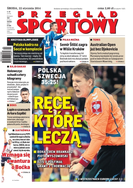 Polska – Szwecja 35:25 – polscy szczypiorniści roznieśli rywali; tak dużej ekipy nie mieliśmy od dawna, tak mocnej – nigdy – do Soczi wysyłamy 56 zawodników i rezerwowego; Hołowczyc schudł cztery kilogramy ; Łapin o szansach Artura Szpilki; sąd Odwoławczy przy PZPS zawiesił Grzegorza Boćka na cztery mecze i ukarał 20 tys. zł; Semir Štilić zagra w Wiśle Kraków.