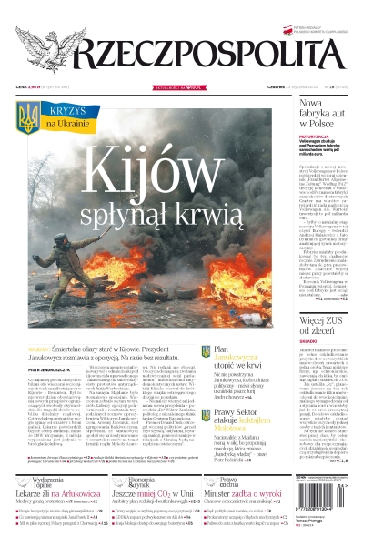 Śmiertelne ofiary starć w Kijowie, Prezydent Janukowycz rozmawia z opozycją – Na razie bez rezultatu; Volkswagen zbuduje pod Poznaniem fabrykę samochodów wartą pół miliarda euro; więcej ZUS od zleceń; lekarze źli na Arłukowicza – medycy grożą protestem; jeszcze mniej CO2 w Unii – ambitny plan redukcji dwutlenku węgla; minister zadba o wyroki – chaos w orzecznictwie ma zniknąć.