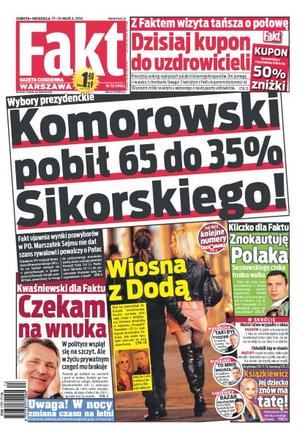 Prawybory prezydenckie w PO: Komorowski pobił Sikorskiego 65 do 35%; Nergal spędza wiosnę z Dodą; Aleksander Kwaśniewski przyznaje, że czeka na wnuka; Kliczko dla „Faktu”: znokautuję Sosnowskiego; prawda o poziomie życia senatora Skorupy; mamy drogi prawie jak z plasteliny; słońce już uwodzi dziewczyny; kobieta – anioł – podarowała dziewczynce wózek inwalidzki, który ta straciła w wyniku kradzieży; palił wsie po kolei, aż sam się przyznał; najlepsi polscy uzdrowiciele; szczęście Weroniki Książkiewicz; właściciel Cracovii twierdzi, że piłkarze zarabiają zbyt dużo; Kubica pokazał, że jest szybki.