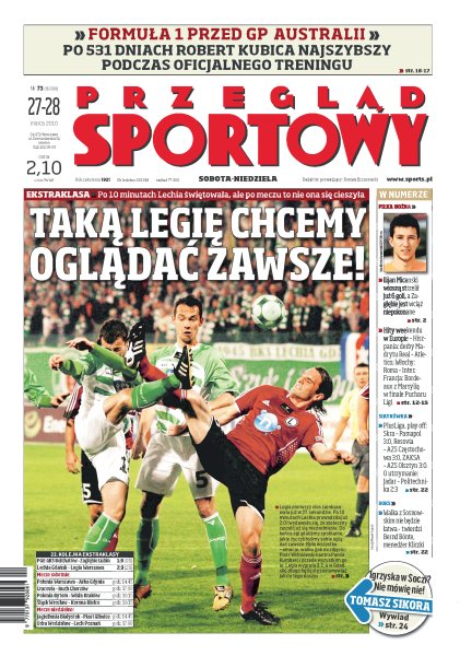 Robert Kubica najszybszy podczas oficjalnego treningu; Legia przełamała złą passę zwycięstwem nad Lechią; Zagłębie Lubin ograło PGE GKS Bełchatów; tydzień z życia ligowca: Dariusz Pawlusiński; Piotr Brożek ostrzega Wisłę przed spotkaniem z Polonią Bytom; Lech Poznań jedzie do Wodzisławia na spotkanie z Odrą; wywiad z Bogusławem Baniakiem, trenerem Motoru Lublin; derby Madrytu: na Santiago Bernabeu Real zagra z Atletico; we Francji Bordeaux z Marsylią w finale Pucharu Ligi; spotkanie Roma – Inter elektryzuje całe Włochy; drużyna Vive Targi Kielce szykuje się do spotkania z HSV Hamburg w 1/8 finału Ligi Mistrzów; Prokom jeszcze nie stracił szans w rywalizacji z Olympiacosem Pireus; wywiad z Berndem Bönte, menedżerem Witalija i Władymira Kliczków; mecz Resovia – AZS Częstochowa zakończył się wynikiem 3:0; Tomasz Sikora przyznaje w wywiadzie, że nie odrzuca myśli o starcie na kolejnych igrzyskach w Soczi.
