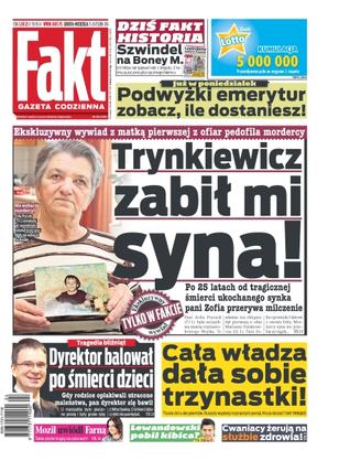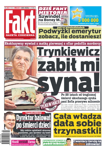Tylko w Fakcie poruszająca rozmowa z matką Wojtusia Pryczka zamordowanego przez Mariusza Trynkiewicza; polska zamarza – nic nie działa, nawet rząd; kontrakt z NFZ wabikiem na udręczonych pacjentów; kulisy kariery Małgorzaty Herde; dzieci nie żyją a dyrektor szpitala jest na balu; zabił chłopca i uciekł w Alpy; Mozil uwiódł Farną; były mąż Rozenek wściekły na Majdana; fiolet jest w modzie; szansa dla Polski – czy zbijemy teraz fortunę na bursztynie; po zwolnieniu z Jagiellonii Tomasz Hajto od 7 miesięcy nie ma pracy.