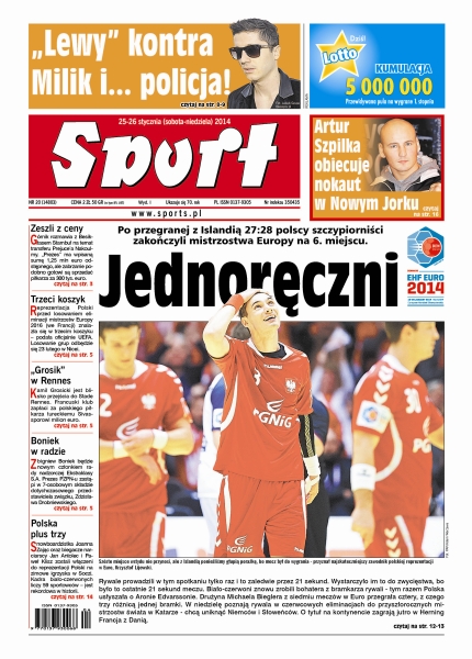 Po przegranej z Islandią 27:28 polscy szczypiorniści zakończyli mistrzostwa Europy na 6. miejscu; UEFA oficjalnie ogłosiła podział drużyn na koszyki przed losowaniem kwalifikacji Euro 2016; nie w pełni sprawny lider światowego rankingu rozwiał marzenia Szwajcarów o ich wewnętrznym finale; snowboardzistka Joanna Zając oraz biegacze narciarscy Jan Antolec i Paweł Klisz zostali włączeni do reprezentacji Polski na igrzyska w Soczi; czy Artur Szpilka i Bryant Jennings potwierdzą, że zasłużyli już na walki z najlepszymi na świecie w wadze ciężkiej.