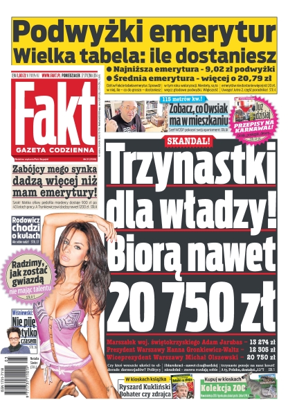 Trzynastki dla władzy, biorą nawet 20 750 zł – czy ktoś wreszcie ukróci to eldorado darmozjadów – politycy i biurokraci – nawet ci najbardziej nieudolni – znowu rozdają sobie trzynaste pensje na nasz koszt; zabójcy mego synka dadzą więcej niż mam emerytury – szok, matka ofiary pedofila mordercy dostaje 900 zł po 40 latach pracy, a Trynkiewiczowi dadzą nawet 1200 zł; zobacz co Owsiak ma w mieszkaniu – szef WOŚP pokazał swój apartament; podwyżki emerytur – wielka tabela, zobacz ile dostaniesz; jak zostać wielką gwiazdą bez pieniędzy, bez talentu, bez urody – jedyny w swoim rodzaju przewodnik Faktu po wielkim świecie; Michał Wiśniewski ma problem z alkoholem – gwiazdor stara się nie przesadzać z piciem, ale nie zawsze się to udaje; Kuba ma sezon z głowy – kapitan reprezentacji Polski zerwał więzadła krzyżowe w kolanie.