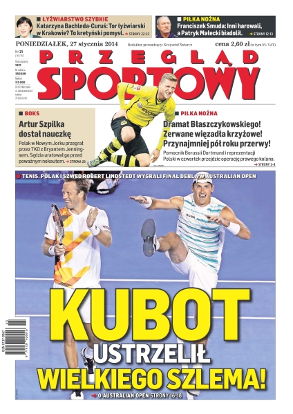 Kubot ustrzelił Wielkiego Szlema – Polak i Szwed Robert Lindstedt wygrali finał debla w Australian Open; dramat Błaszczykowskiego, zerwane więzadła krzyżowe to co najmniej pół roku przerwy – pomocnik Borussii Dortmund i reprezentacji Polski w czwartek przejdzie operację prawego kolana; Artur Szpilka dostał nauczkę – Polak w Nowym Jorku przegrał przez TKO z Bryantem Jenningsem, sędzia uratował go przed poważnym nokautem; operacja Stan – Stanislas Wawrinka pozbawił tytułu kontuzjowanego Rafaela Nadala; Świderskiemu głupio po kicie – Kędzierzynianie stawiali opór tylko na początku meczu, później gospodarze wykorzystali każdą słabość rywali – Skra szybko zapomniała o laniu w Rzeszowie, ZAKSA ma o czym myśleć.