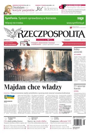 Majdan chce władzy – brak porozumienia między prezydentem i opozycją może oznaczać scenariusz konfrontacji; „Rz” liderem – wg rankingu cytowań za 2013 rok jesteśmy najbardziej opiniotwórczym źródłem informacji; kulisy amnestii – obietnice polityków i bunty więźniów – to kulisy uchwalenia w 1989 r. amnestii, z której skorzystał Mariusz Trynkiewicz, zabójca czterech chłopców, i inni groźni przestępcy; PO ignoruje Kneset – wielka delegacja polityków izraelskich, w tym połowa posłów Knesetu, będzie dziś w Polsce z okazji Dnia Pamięci Ofiar Holokaustu; CIA dzieli polską lewicę – wzajemne oskarżenia po tekście w gazecie; kurczy się rynek chleba – w tym roku upadną kolejne piekarnie; pospieszne odliczanie VAT – pełny zwrot za części i opony do marca.