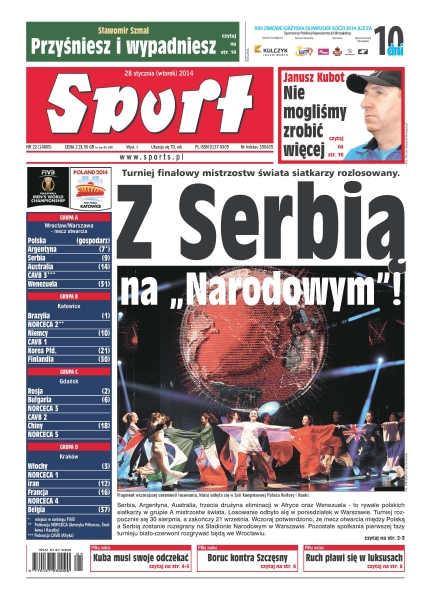 Z Serbią na „Narodowym” – turniej finałowy mistrzostw świata siatkarzy rozlosowany; uwaga na kalorie – „Niebiescy” po przylocie do Turcji i zakwaterowaniu się w hotelu myśleli jedynie o szybkiej kolacji, kąpieli i zajęciu jak najwygodniejszej pozycji w łóżkach – dopiero następnego dnia, już wypoczęci, przekonali się, w jak komfortowych warunkach spędzą blisko dwa tygodnie; życiowa decyzja – szefowie Washington Wizards wierzą w Marcina Gortata, chcą mu zaproponować przedłużenie kontraktu – Polak nie podjął decyzji co zrobi, gdy propozycja padnie; czerwony jak cegła – zespół z Muszyny znów zademonstrował formę poniżej oczekiwań.