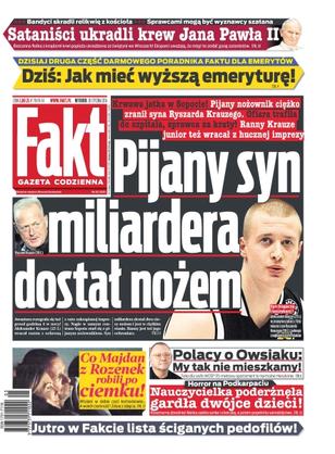 Pijany syn miliardera dostał nożem – pijany nożownik ciężko zranił syna Ryszarda Krauzego, ofiara trafiłą do szpitala, sprawca za kraty – ranny Krauze junior też wracał z hucznej imprezy; sataniści ukradli krew Jana Pawła II – bezcenna fiolka z kroplami krwi papieża ukradziona ze świątyni we Włoszech, eksperci uważają, że mógł to zrobić gang satanistów; co Majdan z Rozenek robili po ciemku – wtuleni w siebie czuli kochankowie... a wokół ciemność; horror na Podkarpaciu – nauczycielka poderżnęła gardła dwójce dzieci – koszmarna zbrodnia! Matka zabiła synka i córeczkę, a potem popełniła samobójstwo; „My tak nie mieszkamy” – Polacy o Owsiaku – tylko dla szefa WOŚP 115-metrowy apartament to normalne mieszkanie.