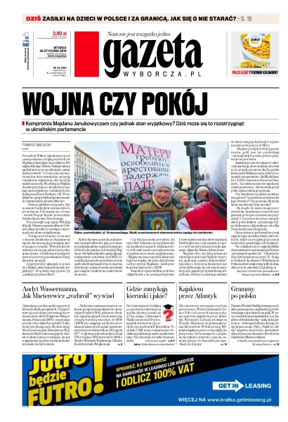 Wojna czy pokój – kompromis Majdanu Janukowyczem czy jednak stan wyjątkowy – dziś może się to rozstrzygnąć w ukraińskim parlamencie; zasiłki na dzieci w Polsce i za granicą – jak się o nie starać; audyt Wassermanna, jak Macierewicz „rozbroił” wywiad – ujawniamy poufny audyt stanu wojskowych służb specjalnych – przygotowano go pod okiem ówczesnego koordynatora ds. służb Zbigniewa Wassermanna; gdzie zamykają kierunki i jakie – na Uniwersytecie Łódzkim po pierwszej rekrutacji na studia dzienne zostało aż 2,7 tys. miejsc, Uniwersytet Śląski zanotował 15-proc. spadek studentów zaocznych, nie uruchomił 17 kierunków; kajakiem przez Atlantyk – dla emerytury ratowania rzucił się przez morze – 67-letni Aleksander Doba z Polic od czterech miesięcy płynie samotnie kajakiem przez Atlantyk; Grammy po polsku – pianista Włodek Pawlik pierwszym polskim jazzmanem z najbardziej prestiżową nagrodą w świecie muzyki.