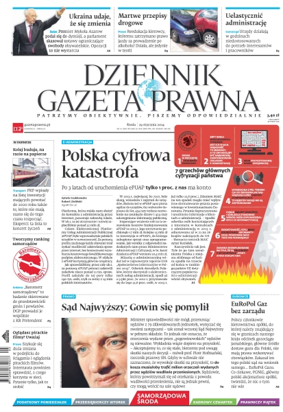Dziennik Gazeta Prawna – codziennie obiektywne i rzetelne informacje z kraju i ze świata. Piszemy o tym, co dziś ważne i odpowiadamy na Wasze pytania – szczególnie te związane z obecnymi wyzwaniami tj. pandemia, praca zdalna. Na bieżąco wyjaśniamy zmieniające się przepisy. Wspieramy się wyjaśnieniami ministerstw i urzędów. Pomagamy unikać błędów i ostrzegamy, jakie są kary. Ponadto w każdy piątek specjalne magazynowe wydanie Dziennika Gazety Prawnej w całości z tekstami społeczno-ekonomicznymi.