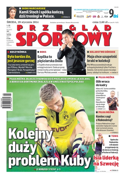 Kolejny duży problem Kuby – Jakub Błaszczykowski dziś przejdzie operację kolana, a Borussia Dortmund znalazła w Anglii następcę Polaka; było bardzo źle, jest jeszcze gorzej – trzy lata temu zmienił się prezes PZKosz, wyniki? Nie ma. Pieniądze? Brak. Perspektywy? Czarna dziura; Szpilka to pięściarska Doda – „U Szpilki show przeważa nad umiejętnościami. Doda przynajmniej trochę umie śpiewać” – Dariusz Michalczewski; Maja chce uzupełnić braki w kolekcji – Mai Włoszczowskiej brakuje w bogatej kolekcji tylko Pucharu Świata – cel na ten sezon ma więc jasny: zdobyć to trofeum; Kamil Stoch i spółka kończą dziś treningi w Polsce; Isia liderką na Szwecję – Agnieszka Radwańska w Krakowie przygotowuje się do meczu ze Szwecją w Pucharze Federacji.