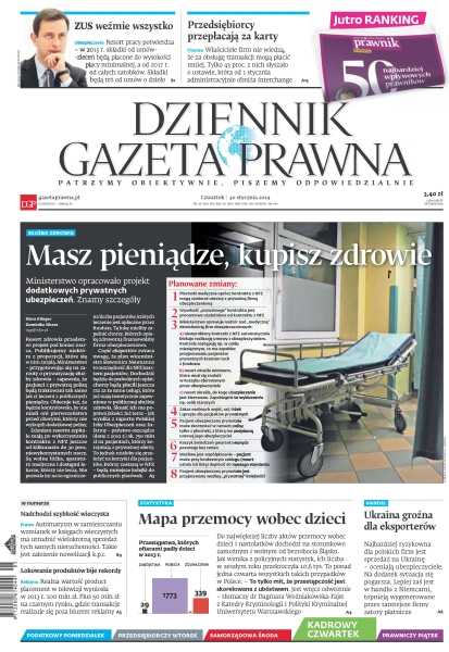 Masz pieniądze, kupisz zdrowie – ministerstwo opracowało projekt dodatkowych prywatnych ubezpieczeń, znamy szczegóły; ZUS weźmie wszystko – resort pracy potwierdza – w 2015 r. składki od umów-zleceń będą płacone do wysokości płacy minimalnej, a od 2017 r. od całych zarobków – składki będą też od umów o dzieło; przedsiębiorcy przepłacają za karty – właściciele firm nie wiedzą, że za obsługę transakcji mogą płacić mniej – tylko 43 proc. z nich słyszało o ustawie, która od 1 stycznia administracyjnie obniża interchange; mapa przemocy wobec dzieci – do największej liczby aktów przemocy wobec dzieci i nastolatków dochodzi na stosunkowo zamożnym i wolnym od bezrobocia Śląsku; Ukraina groźna dla eksporterów – wg ubezpieczycieli najbardziej ryzykowna dla polskich firm jest sprzedaż na Ukrainę; nadchodzi szybkość wieczysta – automatyzm w zamieszczaniu wzmianek w księgach wieczystych ma utrudnić wielokrotną sprzedaż tych samych nieruchomości; lokowanie produktów bije rekordy – realna wartość product placement w telewizji wyniosła w 2013 r. 100 mln zł, plus 50 mln zł na czarnym rynku, gdzie transakcje realizuje się poza biurem reklamy.