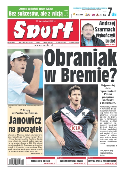 Obraniak w Bremie – najpewniej dziś reprezentant Polski podpisze kontrakt z Werderem; Janowicz na początek – z Rosją w Pucharze Davisa; pierścionek z diamentem – 30 lat temu Polska wygrała w Kalkucie Puchar Nehru, remisując między innymi z Argentyną, mistrzem świata z 1986 roku – pięć meczów Polaków zobaczyło ponad pół miliona ludzi; ostatni test przed Soczi – czy Kamil Stoch poleci na olimpiadę jako lider Pucharu Świata – w Willingen o odzyskanie prowadzenia w klasyfikacji generalnej będzie bardzo trudno.