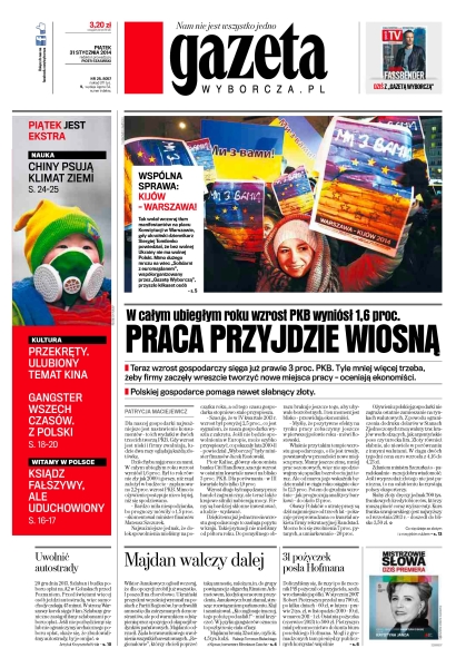 Praca przyjdzie wiosną – w całym ubiegłym roku wzrost PKB wyniósł 1,6 procenta – teraz wzrost gospodarczy sięga już prawie 3 proc. PKB – tyle mniej więcej trzeba, żeby firmy zaczęły wreszcie tworzyć nowe miejsca pracy; Majdan walczy dalej – Wiktor Janukowycz ogłosił wczoraj, że dla opozycji zrobił już wszystko i poszedł na chorobowe – ukraiński prezydent wcześniej wymusił na posłach z Partii Regionów, by uchwalili amnestię dla zatrzymanych demonstrantów, ale pod warunkiem odstąpienia przez opozycję od okupacji budynków państwowych; 31 pożyczek posła Hofmana – doliczyliśmy się, ile razy i po ile rzecznik PiS pożyczał od przyjaciela, szefa wrocławskiej spółki; uwolnić autostrady – jeśli nie pozbędziemy się lub nie ograniczymy archaicznego poboru opłat, okaże się, że zbudowaliśmy autostrady, by je omijać.