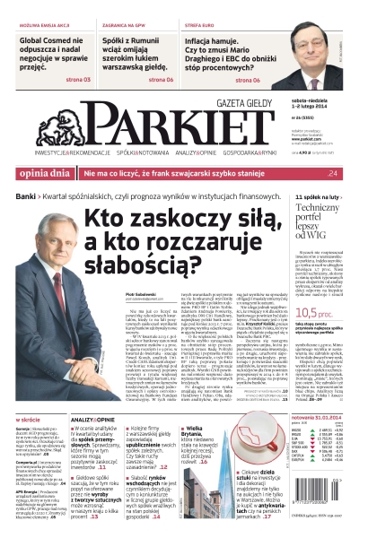 Kto zaskoczy siłą, a kto rozczaruje słabością – kwartał spóźnialskich, czyli prognoza wyników w instytucjach finansowych; możliwa emisja akcji – Global Cosmed nie odpuszcza i nadal negocjuje w sprawie przejęć; zagranica na GPW – spółki z Rumunii wciąż omijają szerokim łukiem warszawską giełdę; strefa euro – inflacja hamuje, czy to zmusi Mario Draghiego i EBC do obniżki stóp procentowych; 11 spółek na luty – techniczny portfel lepszy od WIG; Gorenje – słoweński producent AGD prognozuje, że w tym roku powróci do zyskowności; APS Energia – producent urządzeń zasilania awaryjnego, który w tym roku zadebiutuje na głównym rynku GPW, pracuje nad nową strategią do 2020 r – znamy jej kluczowe elementy; Comperia.pl – internetowa porównywarka produktów finansowych chce sprzedać inwestorom w ofercie publicznej nowe akcje po 22 zł, zapisy ruszają 1 lutego.