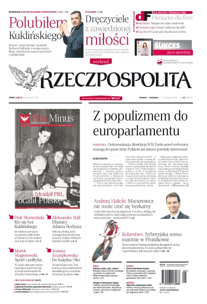 Z populizmem do europarlamentu – dekomunizacja, likwidacja WSI – partie przed wyborami wracają do spraw, które Polaków już dawno przestały interesować; „Macierewicz nie może czuć się bezkarny” – Andrzej Halicki; syberyjska sosna marznie w Pruszkowie – ten tor miał być kuźnią medalistów olimpijskich i dobrą inwestycją finansową – na razie są długi i kłopoty z ogrzewaniem, jeśli zima jest ciężka; reforma szkół, czyli „tralala” – biolodzy, fizycy, chemicy narzekają na zmiany w programach, MEN poniewczasie obiecuje pomoc; ostatni Mohikanie Syberii – na wielkich obszarach rosyjskiej Północy pozostało dziś niespełna ćwierć miliona dawnych gospodarzy tych ziem; tajemnica zatopionych miast – historia naszej cywilizacji kryje się pod wodą, możemy już badać ten zaginiony świat; uwaga na fałszywych księży – podszyć się pod duchownego jest dziecinnie łatwo – wystarczą sutanna, aktorskie umiejętności i tupet.