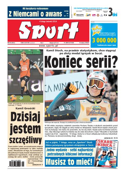 Kamil Stoch, na przekór statystykom, chce sięgnąć po złoty medal igrzysk w Soczi; Kamil Grosicki: dzisiaj jestem szczęśliwy; mistrzostwa Europy koszykarzy rozlosowane: o awans zagramy z Niemcami; wciąż w dziesiątki idą piłkarze, którzy pojawiają się niemalże znikąd na testach w rodzimych zespołach ekstraklasowych; Podbeskidzie Bielsko-Biała: inna rzeczywistość na stadionie; Prejuce Nakoulma nie będzie grał w Besiktasie i najpewniej zostanie w Zabrzu do końca czerwca; pierwszy występ na nowym stadionie w Bilbao pozostanie w pamięci najlepszego piłkarza świata – Cristiano Ronaldo został wyrzucony z boiska.