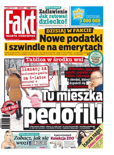 W miejscowości, gdzie żyje pedofil, pojawiła się tablica informująca o jego przestępstwie; nowe podatki i szwindle na emerytach; zobacz, jak wozi się Doda; Isaura nago – unikatowe zdjęcia brazylijskiej aktorki; Europa protestuje: dzisiaj gender, jutro pedofilia; 26 milionów złotych wydamy na loty krajowe posłów; 12-latka ma 20 tysięcy długu odziedziczonego po ojcu; ksiądz zabił ministrantów – dostał tylko dwa lata i trzy miesiące; Andrzej Grabowski będzie jurorem w „Tańcu z gwiazdami”; Kamil Stoch twierdzi, że wygra w Soczi.
