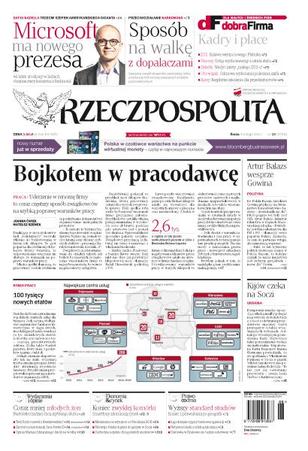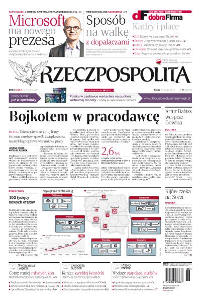 Uderzenie w renomę firmy to coraz częstszy sposób związkowców na szybką poprawę warunków pracy; Microsoft ma nowego prezesa; sposób na walkę z dopalaczami; 100 tysięcy nowych etatów; Artur Balazs wesprze Gowina; Kijów czeka na Soczi; coraz mniej młodych żon – nastolatki rzadziej chcą szybkiego ślubu; Twój Ruch: rozwód z Kwaśniewskim?; zarobić na kanonizacji Jana Pawła II; koniec zwykłej komórki – smartfony zdominują rynek; mieszkania na wynajem od Funduszu BGK; Telewizja Polska dopłaci do igrzysk w Soczi; zachodnie uczelnie chcą polskich studentów; wyższy standard studiów – koniec z prawnikami po geografii; łagodniejsze rygory bankowej egzekucji; nabywca lokalu z solidną rękojmią; starówka w Krakowie nie będzie sołectwem.