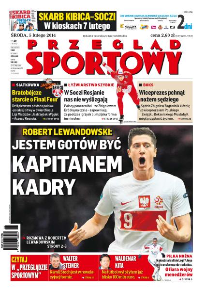 Robert Lewandowski: jestem gotów być kapitanem kadry; bratobójcze starcie o Final Four siatkarskiej Ligi Mistrzów: Jastrzębski Węgiel kontra Asseco Resovia; w Soczi Rosjanie nas nie wyślizgają – panczeniści zapewniają, że forma im nie uleci; wiceprezes Polskiego Związku Bokserskiego pchnął nożem sędziego; czy Nakoulma trafi do Legii.