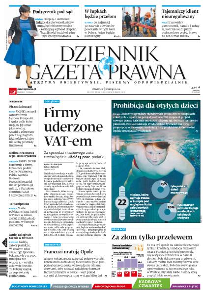 Za sprzedaż służbowego auta trzeba będzie uiścić 23 proc. podatku; przepisy o darmowej książce dla pierwszoklasistów mogą być niekonstytucyjne – ostrzegają sejmowi eksperci; w łupkach będzie przełom: co najmniej 30 nowych odwiertów powstanie w tym roku w Polsce; pracownicy gastronomii, handlu i usług są kontrolowani przez podstawione osoby – prawo na ten temat milczy; UOKiK postawił zarzuty firmie Lyoness Europe AG – oferowany przez nią program lojalnościowy ma cechy piramidy finansowej; Polska Agencja Rozwoju Przedsiębiorczości i Narodowe Centrum Badań i Rozwoju konkurują o firmy, które chcą podbić Dolinę Krzemową – mają do podziału odpowiednio 4,8 i 5 mln zł; marże pobierane przez banki przy kredytach hipotecznych zbliżają się do poziomu europejskiego; maleją zatory płatnicze w firmach; za złom tylko przelewem – to ma być sposób na ukrócenie czarnego rynku i kradzieży; Alstom wykona prace za ponad połowę wartości kontraktu na rozbudowę Elektrowni Opole – jako podwykonawca został wprowadzony tylnymi drzwiami, żeby ratować największy kontrakt infrastrukturalny w Polsce.