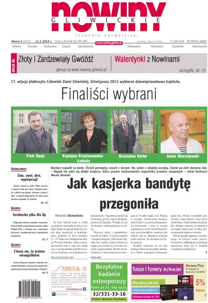 „Nowiny Gliwickie” ukazują się już od 1956 r. Tygodnik obywatelski, który zasięgiem obejmuje Gliwice i powiat gliwicki. Na swoich łamach prezentujemy szeroko pojętą tematykę polityczną, gospodarczą, społeczną, obyczajową, kulturalną, a także sport, ciekawe reportaże i wywiady. Na bieżąco informujemy, co w powiecie piszczy. Jesteśmy organizatorem licznych imprez, takich jak plebiscyt Człowiek Ziemi Gliwickiej czy wybory Miss „Nowin Gliwickich”. Inicjujemy również działalność charytatywną. Opiekujemy się dziećmi ze świetlicy PCK, co roku zapraszamy na wigilię bezdomnych i samotnych. W gazecie nie brakuje okolicznościowych konkursów i zabaw dla czytelników.