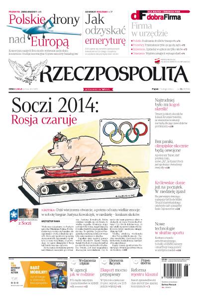 Soczi 2014: Rosja czaruje; PSL rządzi: nepotyzm i marnotrawstwo w ARiMR; Eksport mocno przyspieszy: w tym roku czeka nas 10-proc. wzrost, a w 2015 jeszcze większy; reforma rejestru klauzul niedozwolonych: resort sprawiedliwości chce ukrócić tzw. szantaż konsumencki; polskie drony nad Europą; jak odzyskać emeryturę; RPO kontra poselski immunitet; przed spotkaniem w piątek Putina z Janukowyczem Rosja robi wszystko, aby zmusić Ukrainę do ustępstw; misjonarze nie porzucają Afryki; Italia kontra agencje ratingowe: zapłaćcie za błędy.