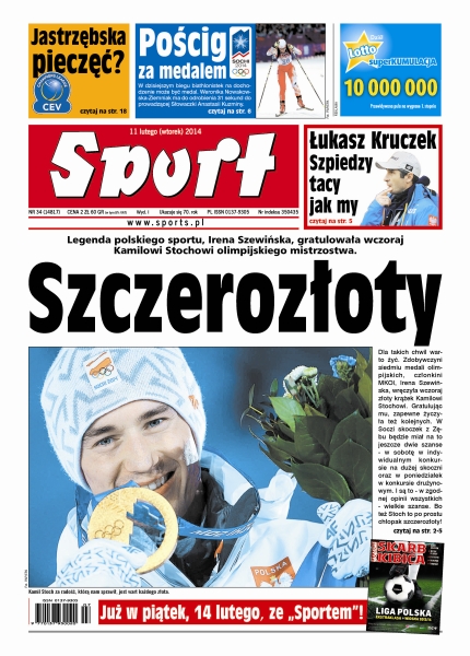 Wczoraj Kamil Stoch odebrał z rąk członkini MKOl, Ireny Szewińskiej, złoty medal olimpijski i wysłuchał Mazurka Dąbrowskiego; chciałbym wystartować na olimpiadzie i zdobyć złoty medal – mówił 12-letni Kamil Stoch w wywiadzie dla TVP. 9 lutego 2014 zrealizował swoje marzenie, ale droga do mistrzostwa olimpijskiego kosztowała go sporo wyrzeczeń i nerwów; dziś Weronika Nowakowska-Ziemniak wystartuje w biegu pościgowym, mając niewielką stratę do podium; nieobecność Justyny Kowalczyk nie musi oznaczać biało-czerwonej pustki na trasie sprintu stylem dowolnym; dwa gole i asysta Messiego przesądziły o sukcesie mistrza Hiszpanii w Sewilli i powrocie