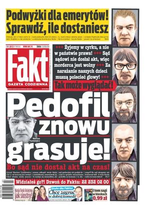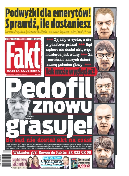 Trynkiewicz pod ochroną wyjechał z więzienia; sędziowie, którzy wypuścili Trynkiewicza; o ile wzrośnie twoja emerytura; morderca Popiełuszki ma 3900 zł emerytury; Kasia Tusk jest jak księżna Kate; tata Radek zabrał na mecz synków Rozenek; Anna Przybylska pajacuje w internecie; Kamil Stoch nie wstydzi się swojej wiary – jest nietuzinkowym człowiekiem, który ma też wiele pasji; nasza reprezentacja została liderem wyścigu sprzętowego na skoczniach; prezydent USA i piosenkarka od dawna są przyjaciółmi.