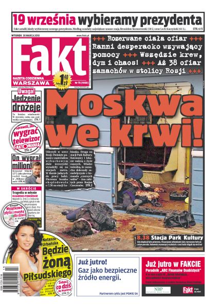 Dwie terrorystki owinięte pasami z materiałem wybuchowym wysadziły się w metrze w Moskwie; o tym, że do urn wyborczych Polacy pójdą 19 września, zdecydował sam marszałek Sejmu Bronisław Komorowski; Aleksander Kwaśniewski nie może się doczekać, aż będzie dziadkiem i już szykuje się do tej roli; Natasza Urbańska dostanie rolę u Jerzego Hoffmana; piłkarze z Lubina wygrywają dla kasy, bo klub za zdobyte punkty płaci im podwójnie; nowy trener Celticu nie wyobraża sobie drużyny bez polskiego bramkarza dyrygującego obrońcami; Mateusz Prus wkrótce może trafić z Zagłębia Sosnowiec do klubu holenderskiej ekstraklasy; szybkość ekipy Renault pomogła Robertowi Kubicy stanąć na podium.