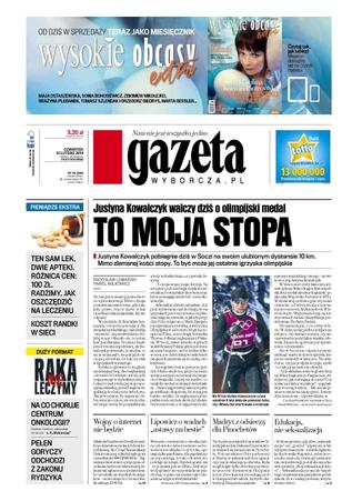 Justyna Kowalczyk pobiegnie dziś w Soczi na swoim ulubionym dystansie 10 km, mimo złamanej kości stopy – to być może jej ostatnie igrzyska olimpijskie; hiszpańscy sędziowie nie będą już ścigać zbrodniarzy na całym świecie; premiera serialu „Klondike” o poszukiwaczach złota na Alasce; przełom w eksperymencie z syntezą jądrową w laserowej instalacji NIF w Kalifornii; we wtorek wieczorem Magdalena Gaj, prezeska Urzędu Komunikacji Elektronicznej, odwołała aukcję na częstotliwości 800 i 2600 MHz; koncerny farmaceutyczne dają aptekarzom rabaty i promocje, ale dyskryminują przy tym małe placówki; kupując w internecie, już teraz masz więcej praw, niż kiedy robisz to w normalnym sklepie; Kamil Stoch przewrócił się na zeskoku podczas treningu – wyglądało groźnie, ale zszedł z dużej skoczni o własnych siłach.