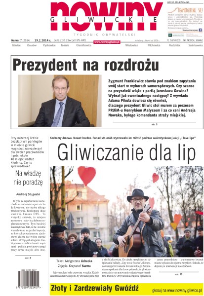 Gliwiczanie dla lip – kochamy drzewa, nawet bardzo, ponad sto osób wyznawało im miłość podczas walentynkowej akcji „I love lipa”; prezydent na rozdrożu – Zygmunt Frankiewicz stawia pod znakiem zapytania swój start w wyborach samorządowych – czy szanse na przyszłość wiąże z partią Jarosława Gowina; na władzę nie poradzę – przy mizernej liczbie bezpłatnych parkingów w mieście gliwicki magistrat zabezpieczył dla swoich pracowników i gości około 40 miejsc wzdłuż Kłodnicy – czy to sprawiedliwe; ciemność, ciemność widzę – od 16 lat mieszkańcy niewielkiej odnogi ul. Leśnej w Żernikach walczą o latarnie – prezydent odpowiada: „zasady są takie same dla wszystkich, sam mieszkam przy ulicy, do której dojazd prowadzi drogą biegnącą wzdłuż lasu”; fotograf z Auschwitz – ważna data w kalendarzu kulturalnym: 19 lutego – tego dnia o godz. 17.00 w Willi Caro spotkanie z Anną Dobrowolską, autorką książki o Wilhelmie Brassem.