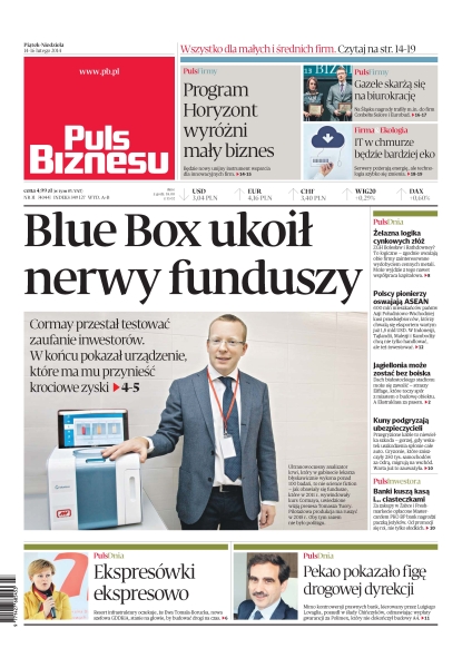 Będzie nowy unijny instrument wsparcia dla innowacyjnych firm; IT w chmurze będzie bardziej eko; Cormay przestał testować zaufanie inwestorów – w końcu pokazał urządzenie, które ma mu przynieść krociowe zyski; 600 mln mieszkańców państw Azji Południowo-Wschodniej kusi przedsiębiorców, którzy chwalą się eksportem wartym już 1,5 mld USD; Jagiellonia może zostać bez boiska; gryzonie, które zniszczyły 250 tys. samochodów za Odrą, migrują na wschód; za zakupy w Żabce i Freshmarkecie opłacone Mastercardem PKO BP bank nagrodzi paczką Jeżyków; resort infrastruktury oczekuje, że Ewa Tomala-Borucka, nowa szefowa GDDKiA, stanie na głowie, by budować drogi na czas; mimo kontrowersji prawnych bank, kierowany przez Luigiego Lovaglia, poszedł w ślady Chińczyków, odmawiając wypłaty gwarancji za Polimex, który nie dokończył budowy A4.