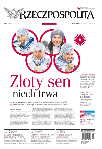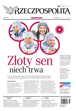 Niesamowita polska sobota, złoto zdobyli najpierw Zbigniew Bródka, a potem Kamil Stoch, dziś kolejna szansa na medal: drużynowy konkurs skoków; kongres PiS: państwo, zdrowie, praca i rodzina; Zygmunt Solorz-Żak dla „Rz”: Polska bez kompleksów; nie chcesz płacić ZUS – zostań nianią.