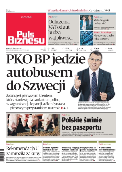 PKO BP jedzie autobusem do Szwecji – Solaris jest pierwszym klientem, który stanie się dla banku trampoliną w zagranicznej ekspansji; odliczenia VAT od aut budzą wątpliwości; małe drogerie budują sieć – pomagają w tym szefowie Hurtowni Kosmetyków I.R. T&T; polskie świnie bez paszportu; rekomendacja U zamroziła zakupy; Polnord wystawił rachunek stolicy.
