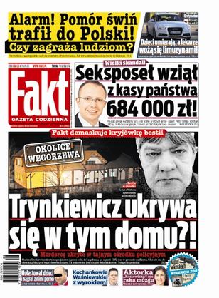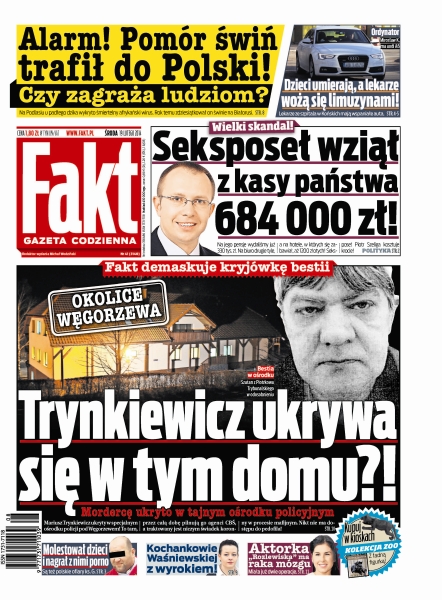 Pomór świń trafił do Polski, czy zagraża ludziom; dzieci umierają, a lekarze wożą się limuzynami – lekarze ze szpitala w Końskich mają wspaniałe auta; seksposeł wziął z kasy państwa 684 000 zł; Fakt demaskuje kryjówkę bestii – zobacz gdzie ukrywa się Trynkiewicz; molestował dzieci i nagrał z nimi porno – są też polskie ofiary ks. G.