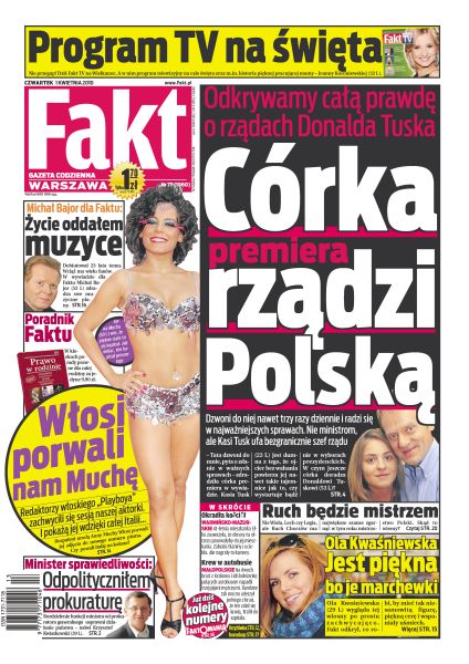 Donald Tusk bezkrytycznie ufa swojej córce i to jej zwierza się z ważnych decyzji; Lech Wałęsa wyleczył kontuzję kręgosłupa, której nabawił się w Berlinie; Andrzej Olechowski nie wstydzi się nosić siatek; unijni urzędnicy chcą zarobić na sprzedaży trunków powyżej 30 proc.; Weronika Książkiewicz dała lekarzowi soczystego buziaka; czy Anna Mucha ma szansę zostać nową boginią Italii; Aleksandra Kwaśniewska nie przestaje zachwycać urodą i smukłą figurą; Michał Bajor swą muzyką zachwyca nas od ponad 20 lat; Józef Wojciechowski zamierza odstąpić swój klub i zainwestować kasę w drużynę rywala zza miedzy; zespół z Chorzowa ma najłatwiejszy terminarz gier z całej ligowej czwórki.