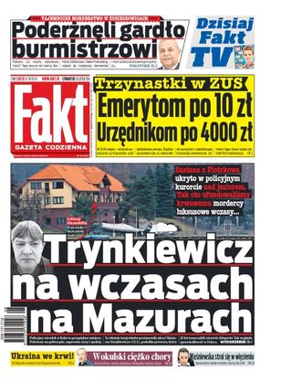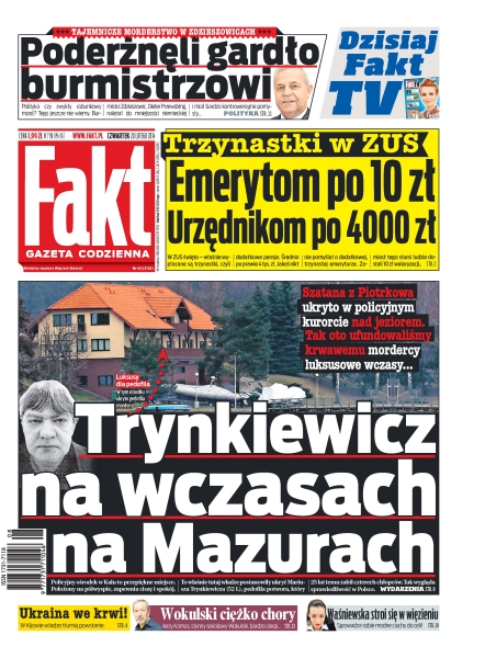 Tajemnicze morderstwo w Zdzieszowicach – trzynastki w ZUS – emerytom po 10 zł urzędnikom po 4000 zł; Trynkiewicz na wczasach na Mazurach – szatana z Piotrkowa ukryto w policyjnym kurorcie nad jeziorem; Ukraina we krwi – w Kijowie władze tłumi powstanie; Jerzy Kamas, słynny serialowy Wokulski, bardzo cierpi...; Waśniewska stroi się w więzieniu.