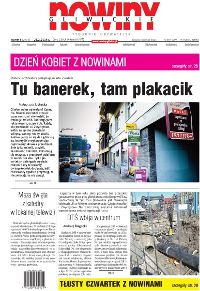 „Nowiny Gliwickie” ukazują się już od 1956 r. Tygodnik obywatelski, który zasięgiem obejmuje Gliwice i powiat gliwicki. Na swoich łamach prezentujemy szeroko pojętą tematykę polityczną, gospodarczą, społeczną, obyczajową, kulturalną, a także sport, ciekawe reportaże i wywiady. Na bieżąco informujemy, co w powiecie piszczy. Jesteśmy organizatorem licznych imprez, takich jak plebiscyt Człowiek Ziemi Gliwickiej czy wybory Miss „Nowin Gliwickich”. Inicjujemy również działalność charytatywną. Opiekujemy się dziećmi ze świetlicy PCK, co roku zapraszamy na wigilię bezdomnych i samotnych. W gazecie nie brakuje okolicznościowych konkursów i zabaw dla czytelników.