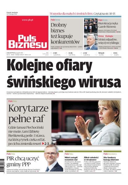 Kolejne ofiary świńskiego wirusa – afrykański pomur świń nie zagraża ludziom — twierdzą eksperci, powołując się na badania naukowe; gdzie Janusz Piechociński nie może, tam Elżbietę Bieńkowską pośle – ustawa, na którą rynek czeka od lat, po cichu zmieniła resort; PIR chcą uczyć gminy PPP; nikiel zastąpił oszustom stal; eliksir młodości w strzykawce; sita funduszy bywają dziurawe.