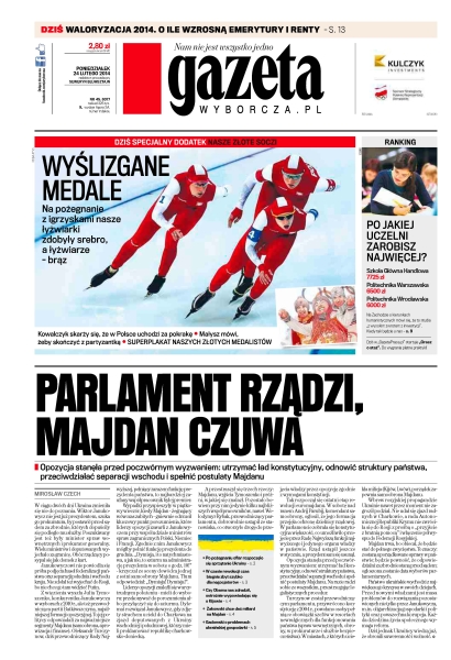 Parlament rządzi, Majdan czuwa – opozycja stanęła przed poczwórnym wyzwaniem: utrzymać ład konstytucyjny, odnowić struktury państwa, przeciwdziałać separacji wschodu i spełnić postulaty Majdanu; wyślizgane medale – na pożegnanie z igrzyskami nasze łyżwiarki zdobyły srebro, a łyżwiarze - brąz; przemoc zaczyna się w podstawówce – dzieciństwo kończy się szybciej – już w piątej klasie dziewczynki nazywane są „dziwkami”, w gimnazjum wylewają się problemy narastające wcześniej; co studiować, aby być mądrym, spełnionym i bogatym – na Zachodzie o kierunkach humanistycznych zaczyna się mówić jako o studiach „z wysokim zwrotem z inwestycji”; elektronika, czyli przedmiot – najbardziej pożądane i kontrowersyjne ze wszystkich zabawek – rynek urządzeń mobilnych dla dzieci rośnie – to, czy telefon lub tablet może zaszkodzić dziecku, zależy głównie od rodziców.