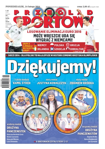 Dziękujemy – Soczi 2014, dla Polski to najlepsze w historii Zimowe Igrzyska Olimpijskie; to był konkurs jej życia – wyrównując własny rekord Polski w skoku wzwyż 2,00m, Kamila Stepaniuk-Lićwinko została główną bohaterką HMP w Sopocie; silny i zwycięski – Michał Kwiatkowski wygrał Volta ao Algarve, Polak odparł w górach ataki Hiszpana Alberto Contadora i mistrza świata, Portugalczyka Rui Costy; burzyciele mitów – dajmy szansę polskim trenerom, apelują młodzi szkoleniowcy; kat nazywał się Jankowski – po ponad 20 latach goście doczekali się ligowej wygranej we Wrocławiu – Śląsk przegrał z Ruchem 2-3; Mistrzostwa Europy 2016 – na pierwsze miejsce nie mamy co liczyć – reprezentacja Adama Nawałki w eliminacjach zagra z Niemcami, Szkocją, Irlandią, Gruzją oraz debiutantem, Gibraltarem.