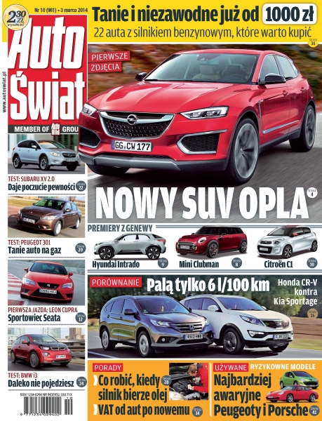 Nowe modele Opla – duży SUV i mały van; Mini Clubman i Hyundai Intrado – debiuty salonu genewskiego; Seat Leon Cupra – sportowa odmiana hiszpańskiego kompaktu; Citroën C1, Peugeot 107 i Toyota Aygo – druga generacja „trojaczków z Kolina”; Honda CR-V kontra Kia Sportage – porównanie SUV-ów z dieslami; Peugeot 301 – niedrogi sedan z instalacją LPG; Subaru XV – crossover z napędem 4x4 i benzynowym bokserem 2.0; BMW i3 – miejskie auto z silnikiem elektrycznym o mocy 170 KM; ile oleju może zużyć auto; nowe zasady odliczania VAT-u w przypadku aut firmowych.